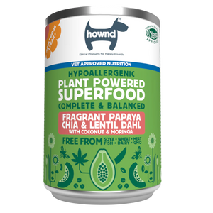 La deliciosa combinación de papaya, chía y lentejas, junto con el superpoder nutricional de la moringa y el coco, hacen de este guiso 100% vegetal de Hownd una comida húmeda completa y sabrosa para tu perro. Hipoalergénica y baja en grasas, este guiso de lentejas, papaya y chía está especialmente indicada para perros con alergias, sensibilidades o sobrepeso.