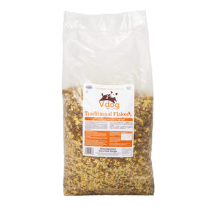 El pienso vegano Traditional Flakes de V-Dogses un alimento completo para perros, elaborado a partir de ingredientes vegetales de la máxima calidad.