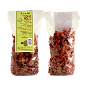 Estos snacks veganos para perros de Hundsfutter se secan al aire de forma natural y tienen una textura extra crujiente y deliciosa. Vienen empaquetadas en una bolsa de celofán 100% compostable, como último paso en su línea de producción basada en la sostenibilidad.
