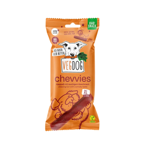 Los palitos dentales Chevvys XL de Vegdog, con su sabor ahumado gracias al pimentón, son la experiencia BBQ perfecta para tu perro, mientras limpia su dentadura.