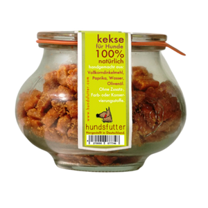 Estos deliciosos snacks veganos de Hundsfutter contienen únicamente harina integral de espelta, pimiento rojo cocido y aceite de oliva, son 100% naturales. Fabricados en el obrador de Hundsfutter en Madrid, no llevan ningún tipo de colorante, conservante o cualquier otro aditivo, libres de cualquier alérgeno. Vienen envasados al vacío para proteger su frescura, en un tarro de cristal reutilizable y reciclable. Estos bocados son aptos para perros de todos los tamaños.