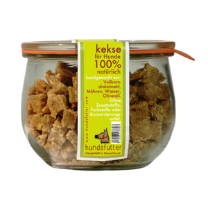 Estos Snacks de Hundsfutter contienen únicamente harina de espelta, zanahoria y aceite de oliva, son 100% naturales. Fabricados en el obrador de Hundsfutter en Madrid, no llevan ningún tipo de colorante, conservante o cualquier otro aditivo, son libres de alérgenos. Vienen envasados al vacío para proteger su frescura, en un tarro de cristal reutilizable y reciclable. Estas galletas son aptas para perros de todos los tamaños.