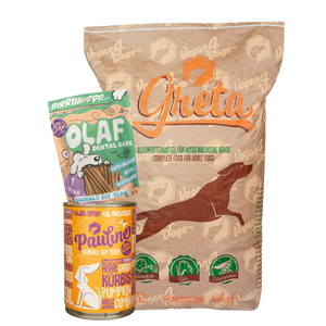 Descubre el Pack de iniciación Vegan4dogs, ideal para introducir a tu perro en una alimentación 100% vegetal. Este pack incluye comida seca, comida húmeda y palitos dentales, respaldados por una de las marcas más reconocidas en nutrición 100% vegetal para peludos:
